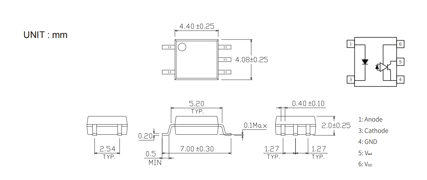 | Product | Package | size(LxWxHmm) | Data Transfer Rate (Mbps) | Supply Voltage(V) | tPHL(ns) | tPLH(ns) | IFT (mA) | CTR(%) | CMR(V/us) | Io(mA) | Topr (Min) (degC) | Topr (Max) (degC) | Viso (Vrms) |